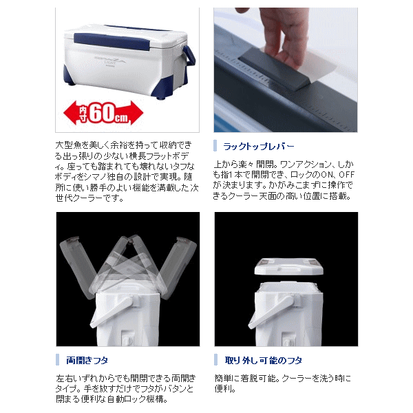 ●ワンアクションでフタを開閉できるラックトップレバー ●天面から引き上げる両面開き仕様で、左右が壁に挟まれてもフタの取り外しが可能 ●フタは落とすだけでロックが可能 ●堅牢なボディで大人が腰をかけても大丈夫 ●本体インナー部素材に、細菌の繁殖を抑制し清潔を保持する抗菌剤ノバロン(R)を採用 ●天面・底面・側面に断熱材を配し、高い保冷力を誇ります ●水抜き簡単ワンアクション水栓 ●ハイグリップラバー(ゴム足)を底4ケ所に配置 ☆